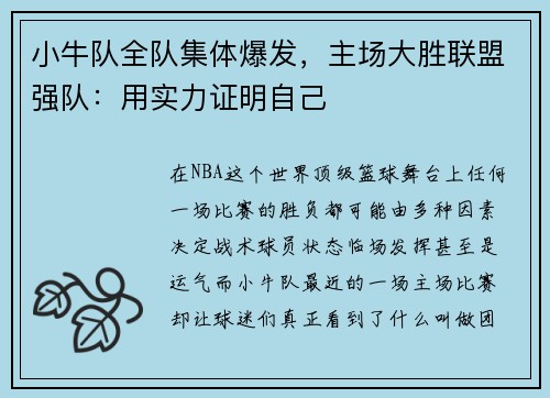 小牛队全队集体爆发,主场大胜联盟强队:用实力证明自己